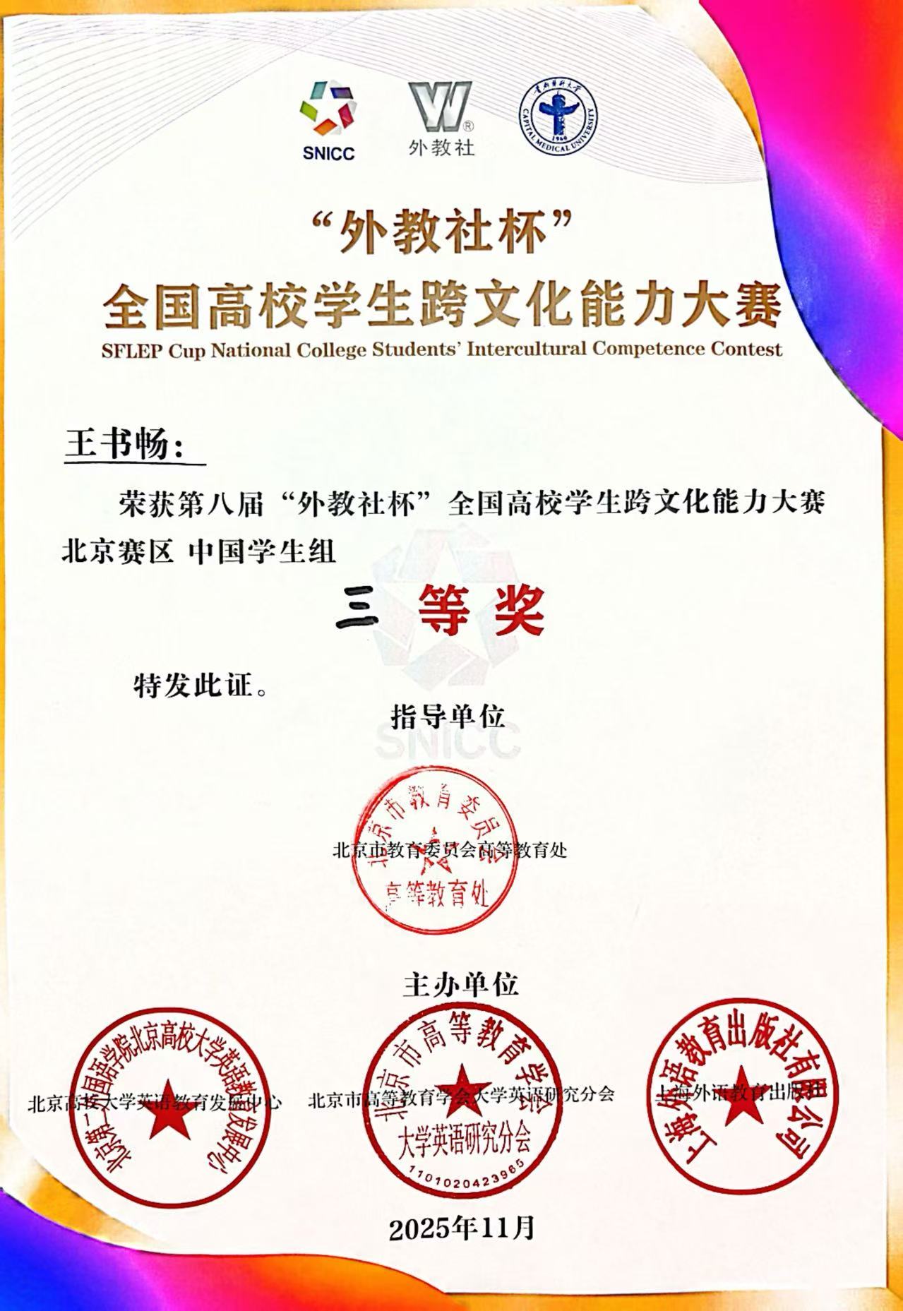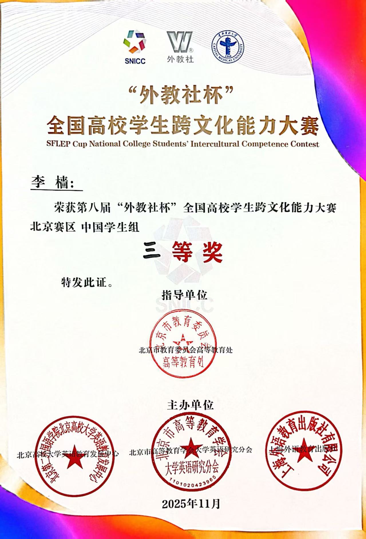 在第八届全国高校学生跨文化能力大赛北京赛区复赛中,由外语系王书畅、通信与信息工程系李樯与张翰儒同学组成的代表队,在屈璟华、王晓涵和赵浩霏老师的精心指导下,展现了敏锐的跨文化洞察力、深厚的文化底蕴和出色的团队协作能力,最终斩获三等奖,指导老师们同时荣获“优秀指导教师奖”。