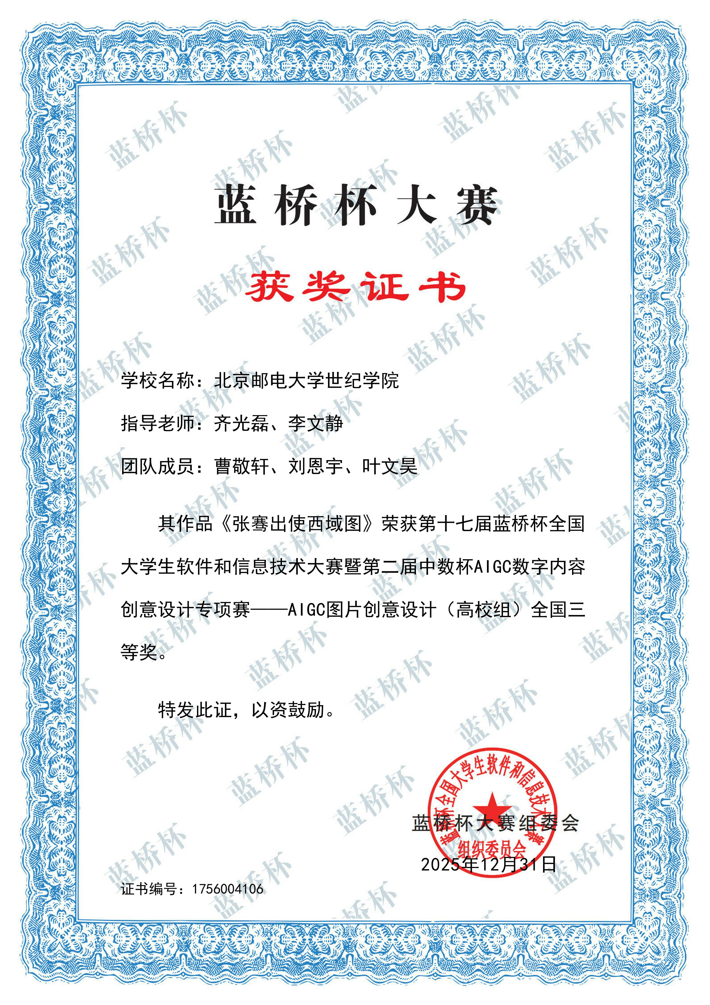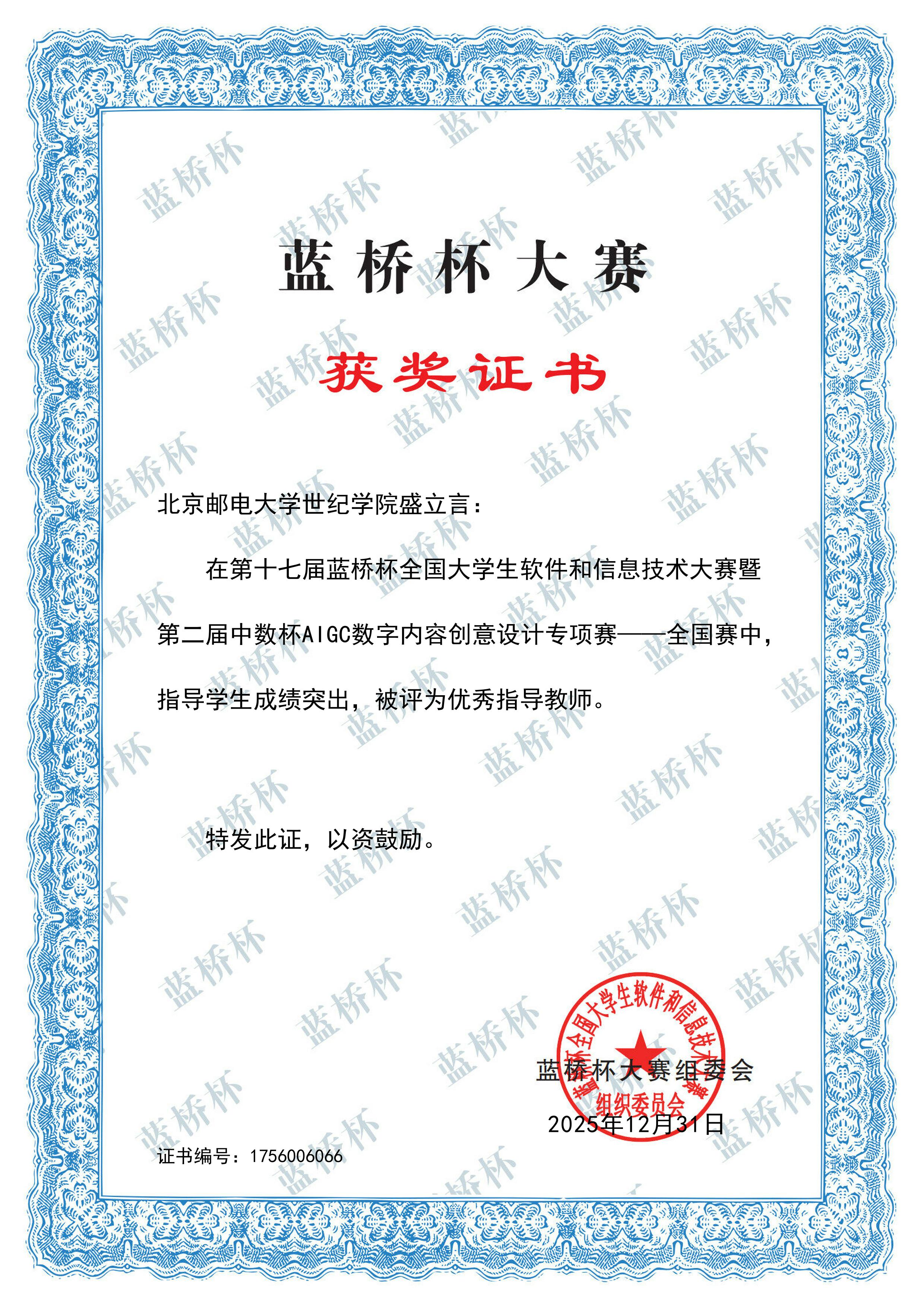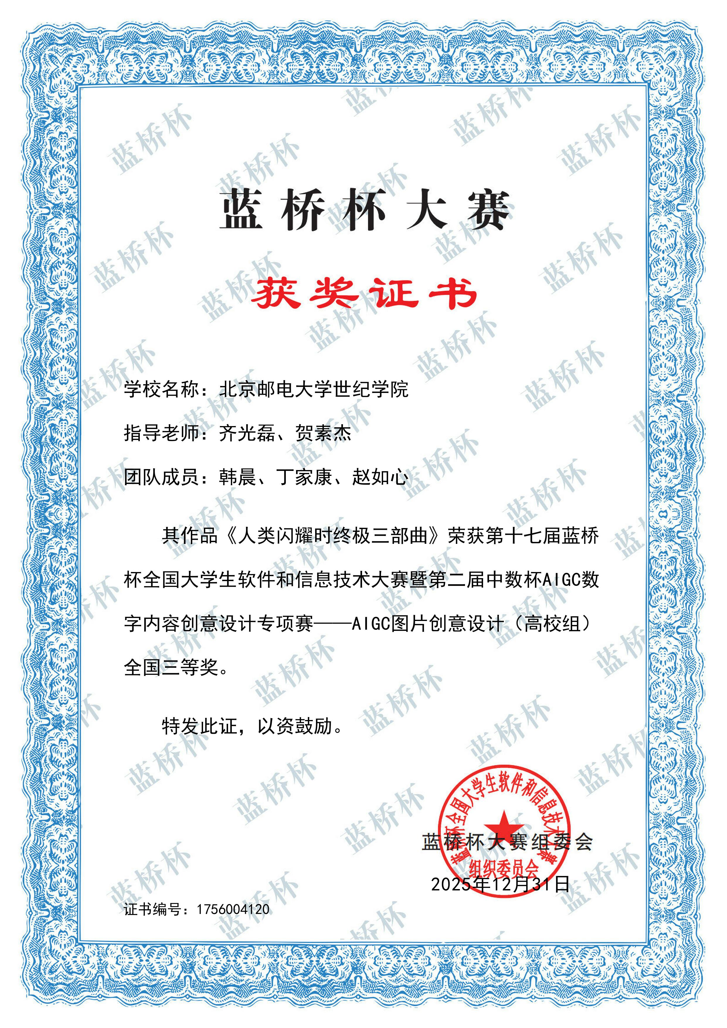 1月4日,第十七届蓝桥杯大赛专项赛暨第二届中数杯AIGC数字内容创意设计大赛全国赛结果揭晓,学院学子凭借扎实的专业功底与创新的设计思维,在赛事中表现亮眼,共斩获全国一等奖2项、全国二等奖3项、全国三等奖7项,总计12项全国奖项。其中,人工智能创新工作室贡献了全部一等奖、二等奖及5项三等奖,成为本次赛事获奖的核心力量。